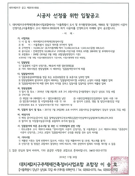 지난달(11월) 30일 대치2지구 재건축 정비사업조합(조합장 이승호ㆍ이하 조합)은 시공자 선정을 위한 입찰공고를 냈다. 이는 그달 18일 사업시행인가를 받은 데 따른 후속 조치다.