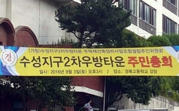 2일 대구 수성구청 및 수성지구우방타운2차 정비사업조합 설립추진위원회(이하 추진위) 등에 따르면 추진위는 내일(3일) 오후 3시 단지 인근에 위치한 경북고등학교 강당에서 주민총회를 개최한다.