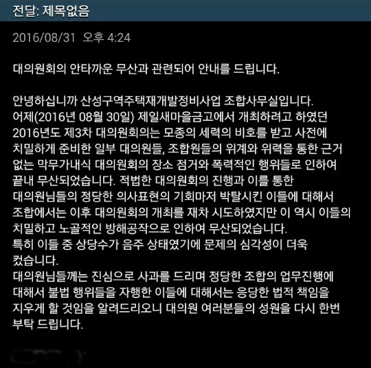 이달 1일 업계 등에 따르면 산성구역 재개발 조합(조합장 강용득)이 지난달(8월) 30일 개최하려던 2016년도 제3차 대의원회가 무산됐다. 이는 일부 대의원ㆍ조합원들의 근거 없는 막무가내 식 회의장 점거와 폭력 행위로 인해 도저히 회의를 진행할 수 없다는 조합 측 판단에 따른 것이란 전언이다.