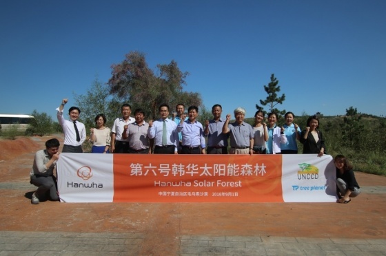 한화그룹은 이 지역에 ’12년 태양광 발전설비 기증, ’13년 20만그루 규모의 <태양의 숲 2호>와 ’15년 지역 초등학교 내 <태양의 숲 5호>를 조성한 데 이어, 이번에 추가로 <태양의 숲 6호>를 조성하는 등 지속적인 친환경 사회공헌 사업을 통해 사막발 황사와 미세먼지 방지에 기여해 오고 있다.