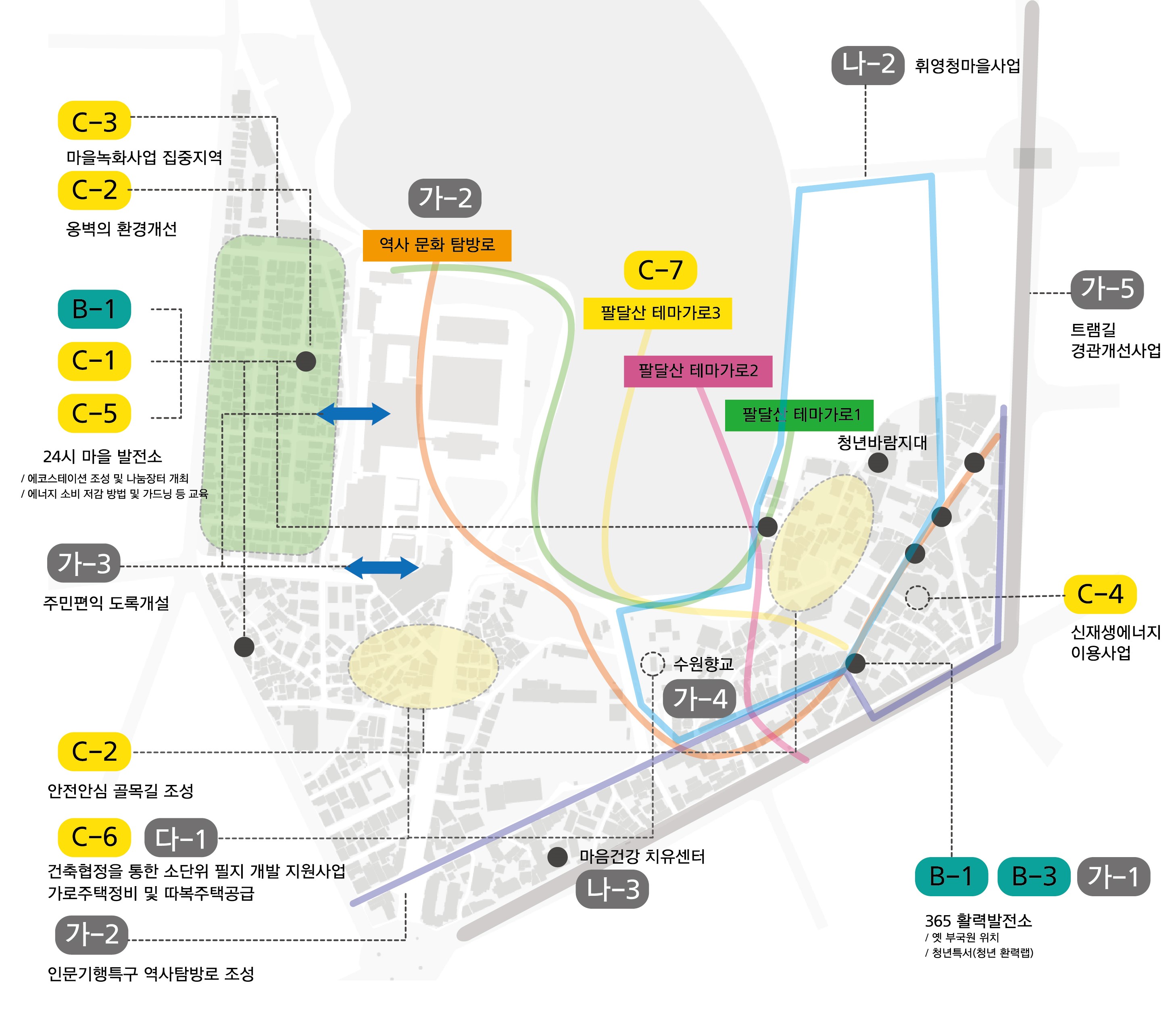 경기도형 도시재생사업은 매산동 일원 43만8천㎡에 문화·역사탐방로와 안전안심 골목길, 공유적 시장경제 실현을 위한 청년특구, 창업시설 등을 조성하는 사업으로 100억원이 투입된다. 수원시르네상스 사업은 매산동 일원 9만5천㎡에 골목·주차장·CCTV 등을 설치하는 것으로 50억원의 예산이 투입된다. 행궁동 도시재생사업은 행궁동 일원 78만7천㎡에 문화체험공간, 창업공간 등을 조성하는 것으로 100억원의 예산이 투입된다. 도시재생뉴딜은 매산동 19만8천㎡에 250억원이 투입돼 수원역 앞길, 청년 다문화살리기사업 등이 진행된다.